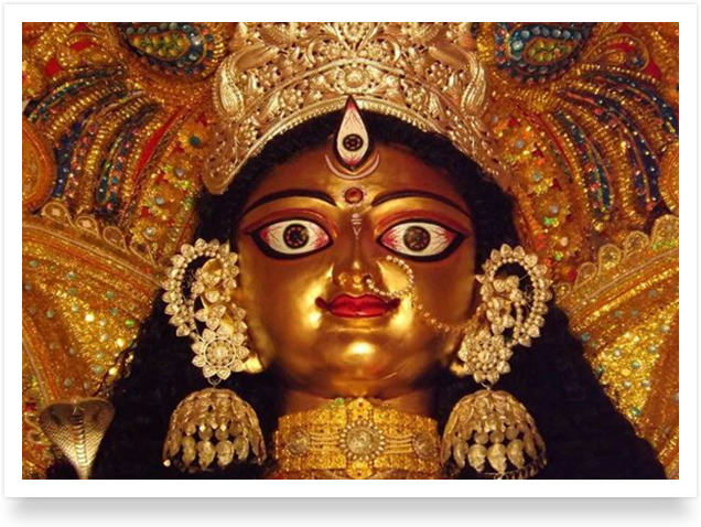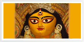 The beginning of Jagadhatri puja in Chandannagar probably dates back earlier than 1750. Indranarayan Choudhury performed the Jagadhatri puja at his own house in Chandannagar, at the time Krishna Chandra used to come to borrow money from Indranarayan Choudhury. Perhaps Krishnachandra was attracted to greatness of Jagadhatri at this time. The formal difference between Durga and Jagadhatri occurs in 'Mayatantra' and Jagadhatri is mentioned with reference to Durga in Krishnanda's 'Tantasaar'. The ruling to perform the special puja of the goddess on the ninth lunar day of the light fortnight in the month of Kartick has been referred in 'Krityatattarnab' by Srinath Acharyachuramoni of the 15th-16th century. The fourhanded goddess is carried by the lion everywhere, an elephantlies of the feet of the lion. The idol has an old fashioned shaping, i.e. the face cutting is of a longish pattern; it has large eyes spread upto the years and the four hands display conch, discus, shaft, and bow respectively. The snake is her sacred thread. One of the main attraction of Jagadhatri idol of Chandannagar is the ornamental decoration of the goddess with sola and beautiful canvas of mats with painting at the back of the image.