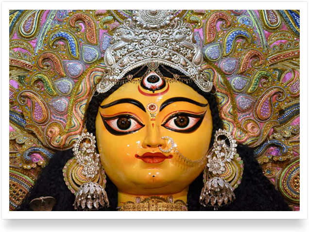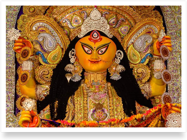 The beginning of Jagadhatri puja in Chandannagar probably dates back earlier than 1750. Indranarayan Choudhury performed the Jagadhatri puja at his own house in Chandannagar, at the time Krishna Chandra used to come to borrow money from Indranarayan Choudhury. Perhaps Krishnachandra was attracted to greatness of Jagadhatri at this time. The formal difference between Durga and Jagadhatri occurs in 'Mayatantra' and Jagadhatri is mentioned with reference to Durga in Krishnanda's 'Tantasaar'. The ruling to perform the special puja of the goddess on the ninth lunar day of the light fortnight in the month of Kartick has been referred in 'Krityatattarnab' by Srinath Acharyachuramoni of the 15th-16th century. The fourhanded goddess is carried by the lion everywhere, an elephantlies of the feet of the lion. The idol has an old fashioned shaping, i.e. the face cutting is of a longish pattern; it has large eyes spread upto the years and the four hands display conch, discus, shaft, and bow respectively. The snake is her sacred thread. One of the main attraction of Jagadhatri idol of Chandannagar is the ornamental decoration of the goddess with sola and beautiful canvas of mats with painting at the back of the image.